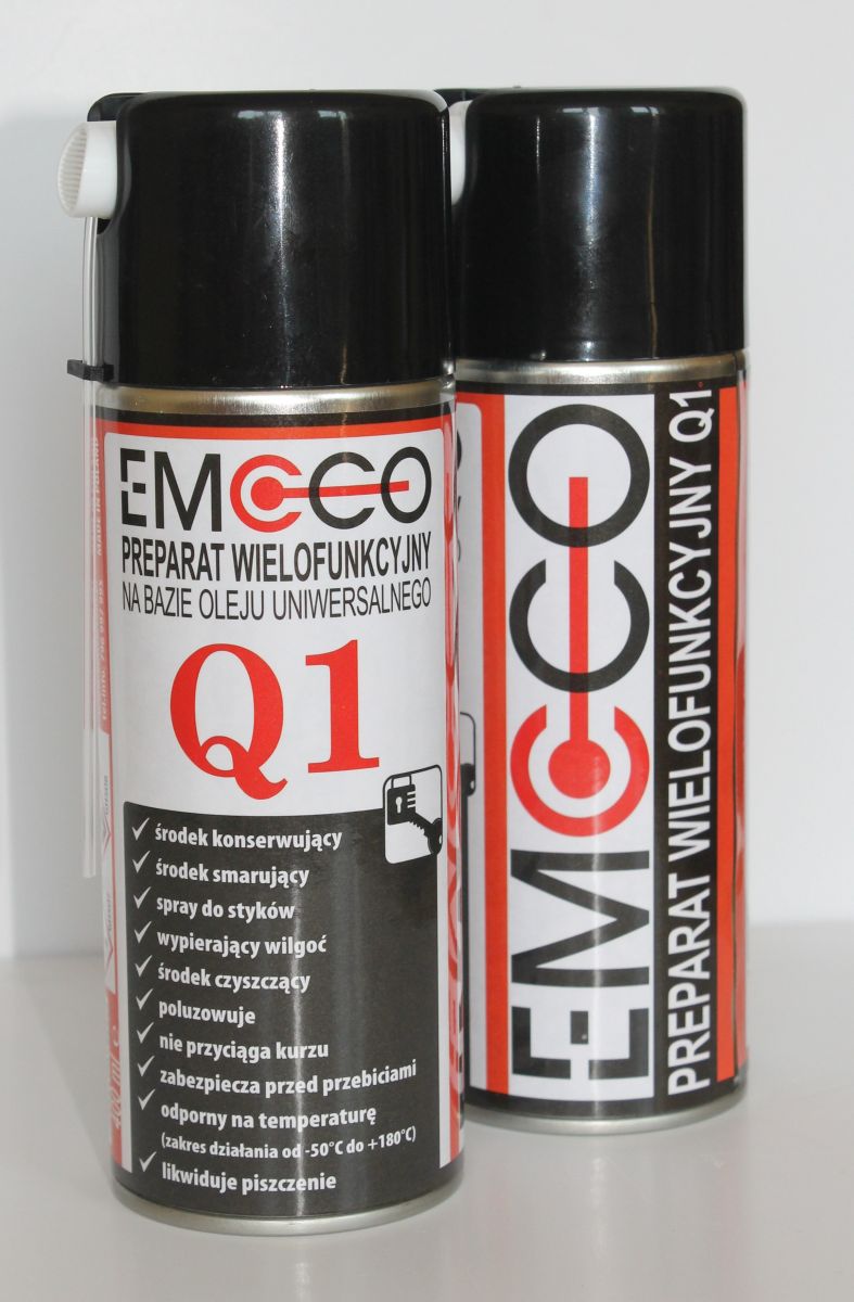 Preparat wielofunkcyjny EMCCO Q1 posiada doskonałe właściwości penetracyjne, zapewnia precyzyjne nanoszenie, odporność na temperaturę od -50°C do +180°C, nie zawiera silikonu ani teflonu, żywic ani kwasów. Preparat posiada długotrwałą lepkość. Ponadto likwiduje piszczenia, wypiera wodę, rozpuszcza rdzę, chroni i konserwuje cylindry zamków i metale, usuwa smołę, nie przyciąga kurzu. Preparat EMCCO Q1 doskonale ochrania maszyny w warunkach wilgotnych. Dzięki bezbarwnej barwie, ma szerokie zastosowanie do konserwacji sprzętu biurowego. Ś;rodek smarujący nie jest toksyczny, fizjologicznie jest obojętny.