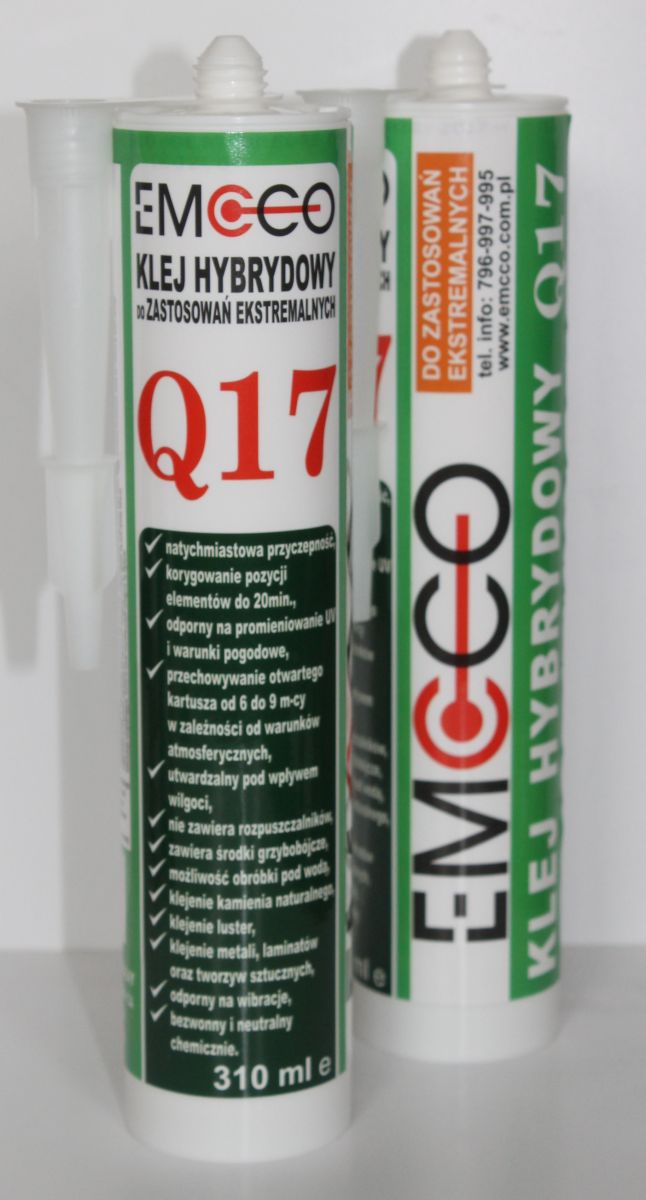 Klej EMCCO Q17 MS POLYMER – HYBRYD to klej nowej generacji o wyjątkowych właściwościach. Posiada dużą siłę spajania początkowego oraz doskonałą przyczepność (możliwość korygowania do 20minut) do większości materiałów i podłoży, nawet wilgotnych, z wyjątkiem PE, PP, teflonu i bitumów. Klej utwardza się pod wpływem wilgoci. Powierzchnie klejone nie wymagają gruntowania, jedynie oczyszczenia z ewnetualnych zabrudzeń. Klej niewrażliwy na wiele chemikaliów, odporny na warunki atmosferyczne, daje się malować farbami, nawet wodnymi, nie przebarwia materiałów. KLEJ EMCCO Q17 JEST CAŁKOWICIE NEUTRALNY. Po utwardzeniu odporny na temperatury od -40°C do +90°C. Klej EMCCO Q17 ma szerokie zastosowanie: ceramika, kamień naturalny, aluminium, tworzywa sztuczne, styropian, drewno, płyty wiórowe, płyty gk, wełna mineralna, porcelana, lustra. Klej polecany jest do uszczelnień sanitarnych (umywalki, wanny, kabiny prysznicowe), blatów kuchennych oraz uszczelnień płytek.