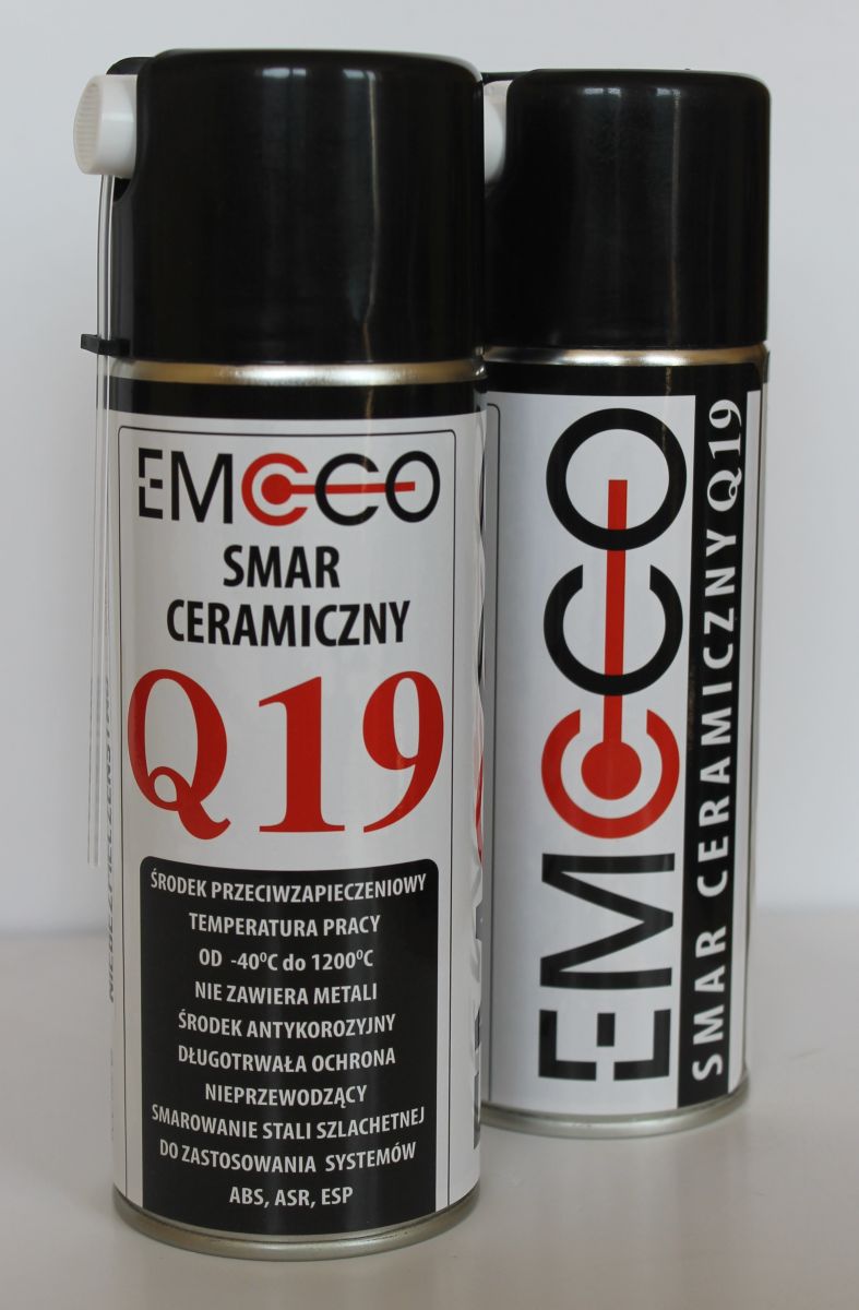 Smar ceramiczny EMCCO Q19 to najwyższej jakości środek smarny oraz przeciwzapieczeniowy. Dzięki silnym dodatkom antykorozyjnym i antyutleniającym zapewnia długotrwałą ochronę i smarowanie w trudnych warunkach pracy. Chroni przed działaniem wody, kwasów, zasad i soli. Chroni również przed zabrudzeniem, korozją, zapiekaniem. Smar ceramiczny EMCCO Q19 zachowuje swoje właściwości w temperaturze od -40°C do +1200°C. W swoim składzie nie zawiera metali. Zastosowanie: podczas montażu sond lambda i innych elementów układu spalinowego, do smarowania elementów układów hamulcowych z systemem ABS. Produkt zalecany przy montażu felg aluminiowych na piastach.