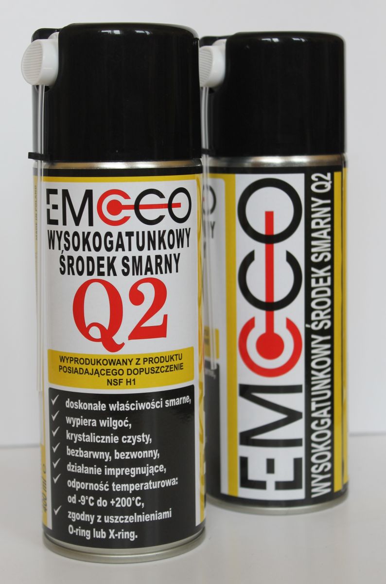 Preparat EMCCO Q2 to wysokiej jakości bezbarwny środek smarny służący do pielęgnacji i smarowania łańcuchów napędowych, kół łańcuchowych oraz linek naciągowych. Ś;rodek ten przeznaczony jest dla przemysłu spożywczego (wyprodukowany z produktu posiadającego dopuszczenie NSF – H1). Dodatkowo ze względu na bardzo dobrą przywieralność do każdej powierzchni świetnie smaruje i zabezpiecza łożyska, mechanizmy, zawory, zębatki itp. Ś;rodek smarny można stosować do łańcuchów zwykłych oraz tych wyposażonych w uszczelnienia typu O-Ring lub X-Ring. Zalecany jest do wszystkich rodzajów łańcuchów, do prowadnic i transporterów, a także do łożysk wolnoobrotowych. Przed użyciem dokładnie wymieszać zawartość pojemnika. Ś;rodek po naniesieniu na powierzchnię przez chwilę pozbywa się gazu nośnego bąbelkując (zagęszcza się). Ten stan przejściowy pozwala na głęboką penetrację czynnika smarnego.