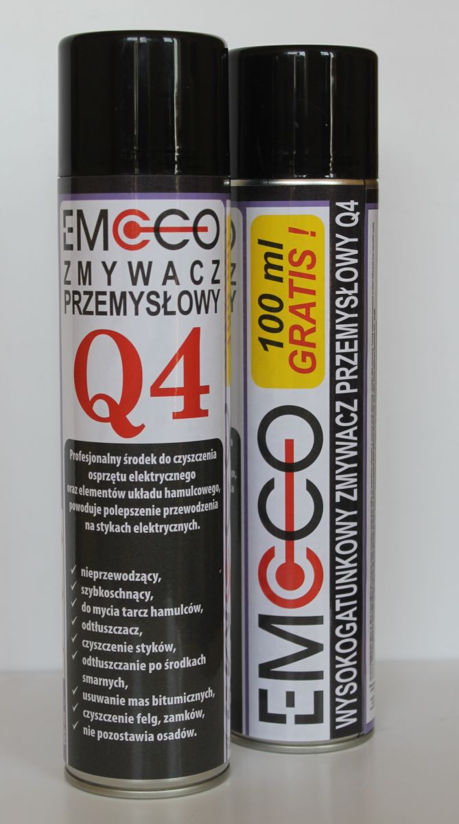 Preparat EMCCO Q4 to profesjonalny zmywacz przemysłowy o wysokiej jakości działania środek o wszechstronnym zastosowaniu: do czyszczenia osprzętu elektrycznego i elementów układu hamulcowego. Powoduje polepszenie przewodzenia na stykach elektrycznych przez czyszczenie i szybkie odparowanie. EMCCO Q4 to wielofunkcyjny rozpuszczalnik: rozpuszcza i usuwa smar, oleje, żywice, osady, śniedź, płyn hamulcowy i inne. Skuteczny przy czyszczeniu silników elektrycznych alternatorów, kostek, złączy, wtyków, klocków, bębnów tarcz hamulcowych, tarcz – sprzęgła.