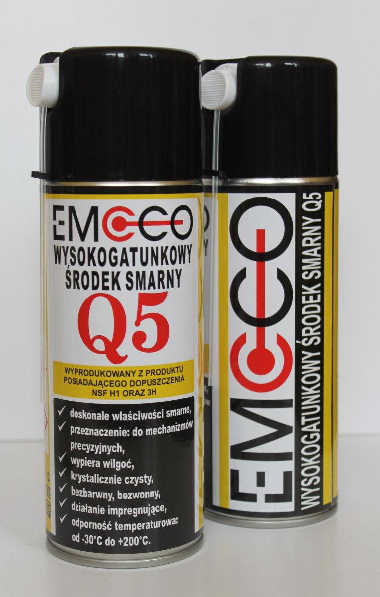 Preparat EMCCO Q5 to wysokogatunkowy ultra czysty środek smarny. Produkt wypiera wodę, ma dobrą płynność w niskich temperaturach, nie posiada smaku i zapachu. Może on być stosowany jako środek smarny do mechanizmów precyzyjnych, łożysk, jako środek czyszczący do stali nierdzewnej, jako środek smarny w układach pneumatycznych, jako środek antyadhezyjny do form i podajników.