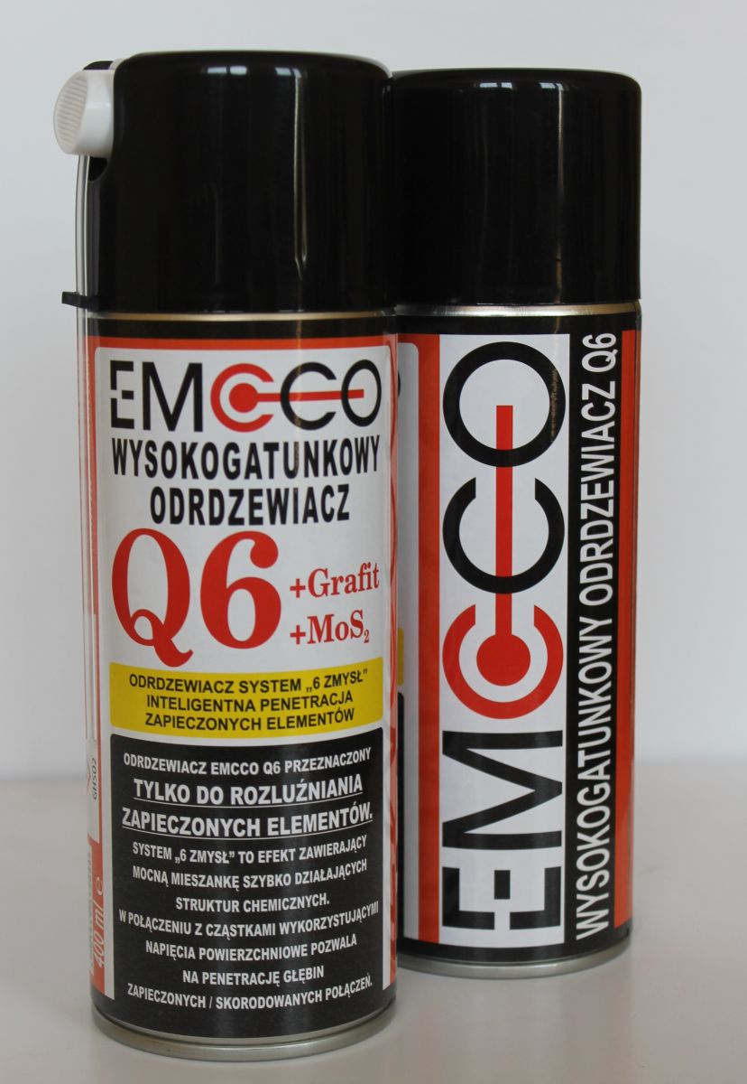 Preparat EMCCO Q6 to wysokogatunkowy odrdzewiacz zawierający Grafit oraz MoS2, co w połączeniu daje mocną mieszankę szybko działających struktur chemicznych. W wyniku połączenia z cząstkami wykorzystującymi napięcia powierzchniowe pozwala na penetrację w głąb zapieczonych lub skorodowanych połączeń. Produkt EMCCO Q6 zalecany jest tylko do rozluźniania zapieczonych elementów np. śrub, zawiasów, nakrętek. Rozpuszcza nalot z kamienia, węgla, wapnia, żywicę, ponadto usuwa smołę oraz tłuszcze.