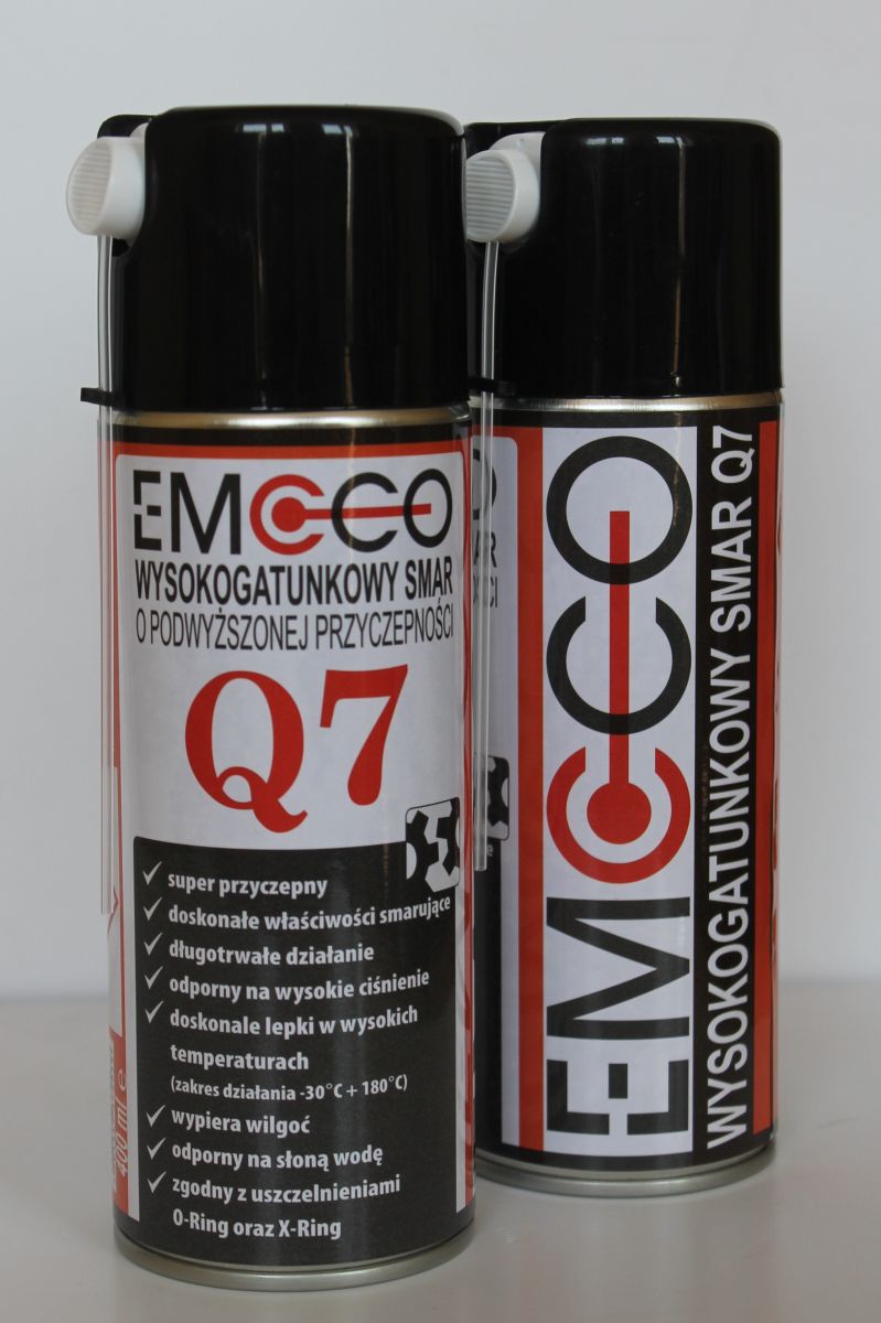 Preparat EMCCO Q7 to wysokiej jakości smar posiadający doskonałe właściwości smarujące. Produkt stworzony, aby zapewnić znakomitą, długotrwałą ochronę urządzeń. Służy do pielęgnacji i smarowania łańcuchów napędowych, kół łańcuchowych, zębatych oraz sworzni. Dodatkowo ze względu na znakomitą przyczepność do każdej powierzchni świetnie smaruje i zabezpiecza łożyska, mechanizmy, zawory oraz zębatki. Smar można stosować do łańcuchów zwykłych oraz tych, które są wyposażone w uszczelnienia typu O-Ring oraz X-Ring. Ś;rodek smarujący EMCCO Q7 zalecany jest do prowadnic i transporterów oraz do łożysk wolnoobrotowych.
