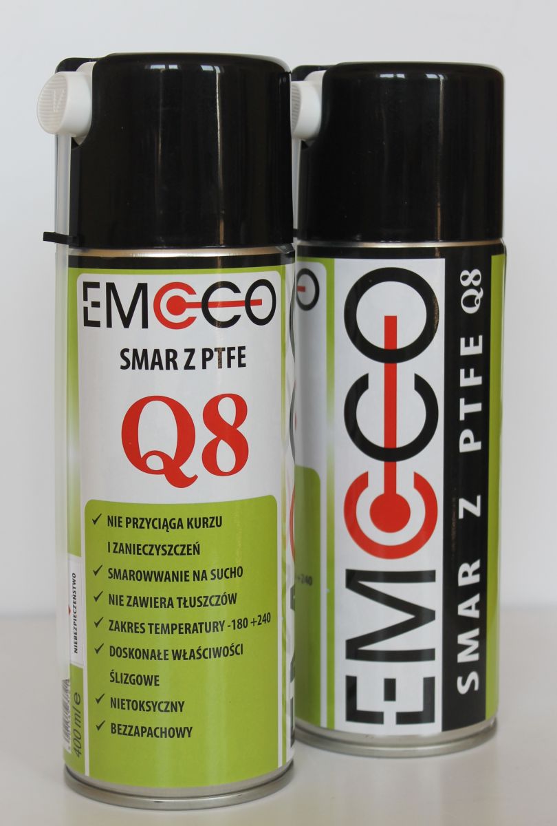 Smar PTFE EMCCO Q8, tworzący na podłożu suchą warstwę poślizgową. Doskonały środek smarny przeznaczony do wszystkich typów napędów łańcuchowych, przekładniowych i taśmowych.