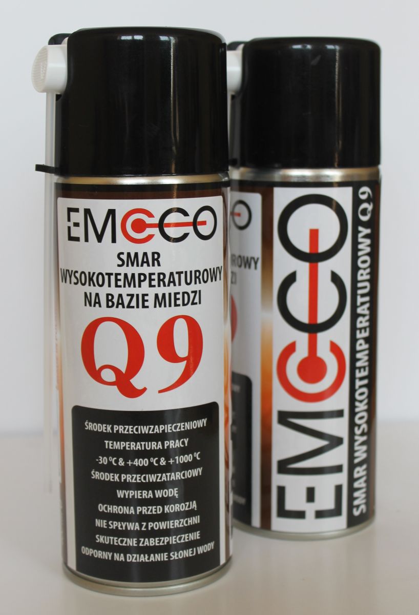 Preparat EMCCO Q9 to wysokotemperaturowy smar stosowany do elementów pracujących w wysokich temperaturach. Zalecany jako smar montażowy do zabezpieczania przed zapieczeniem współpracujących części, np. świece zapłonowe, elementy układu wydechowego oraz hamulcowego, zasuwy, przekładnie itp.